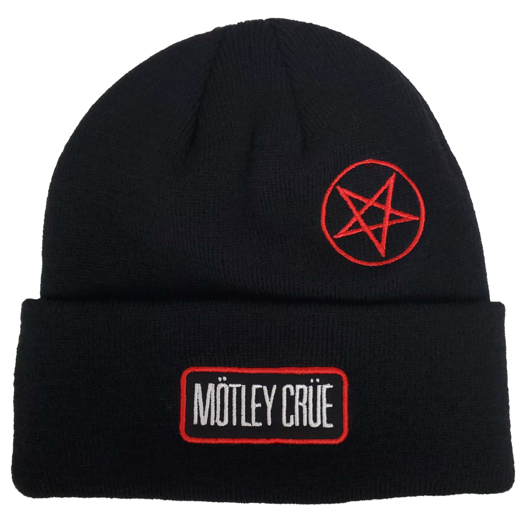 MOTLEY CRUE CUT TWILL PACTH EMROIDERED LOGOS 1X1 RIBBED BLACK ACRYLIC KNIT HAT